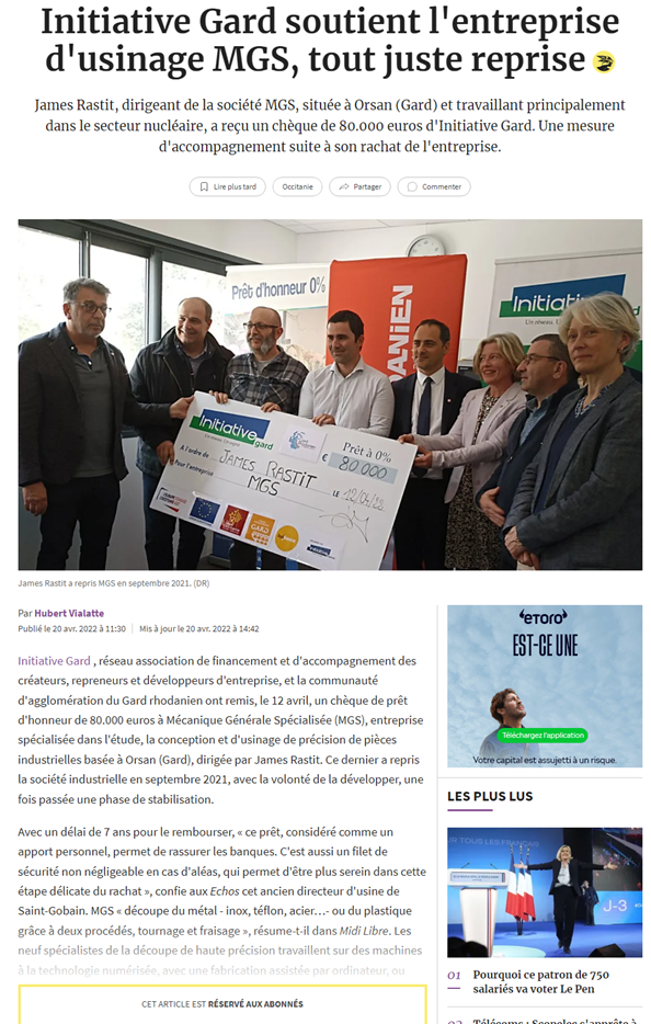 - Midi Libre - 25 10 2022 - Avec 2,5 M€ de prêts, Initiative Gard a aidé 161 entreprises en 2021
