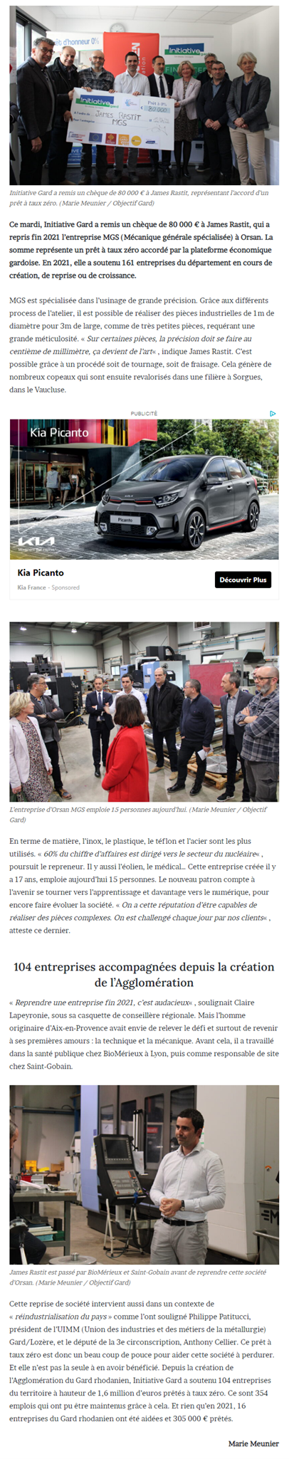 ORSAN - Initiative Gard prête 80 000 € au repreneur de la société MGS